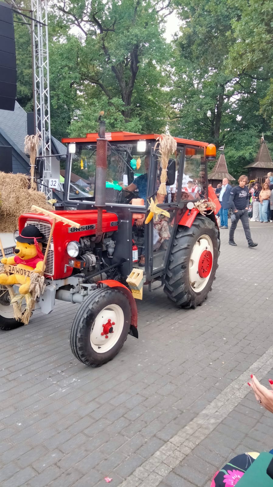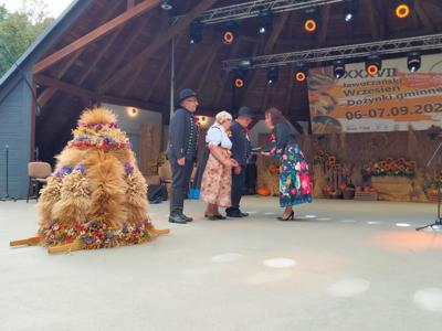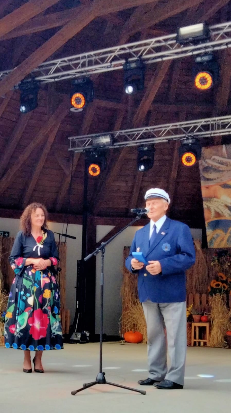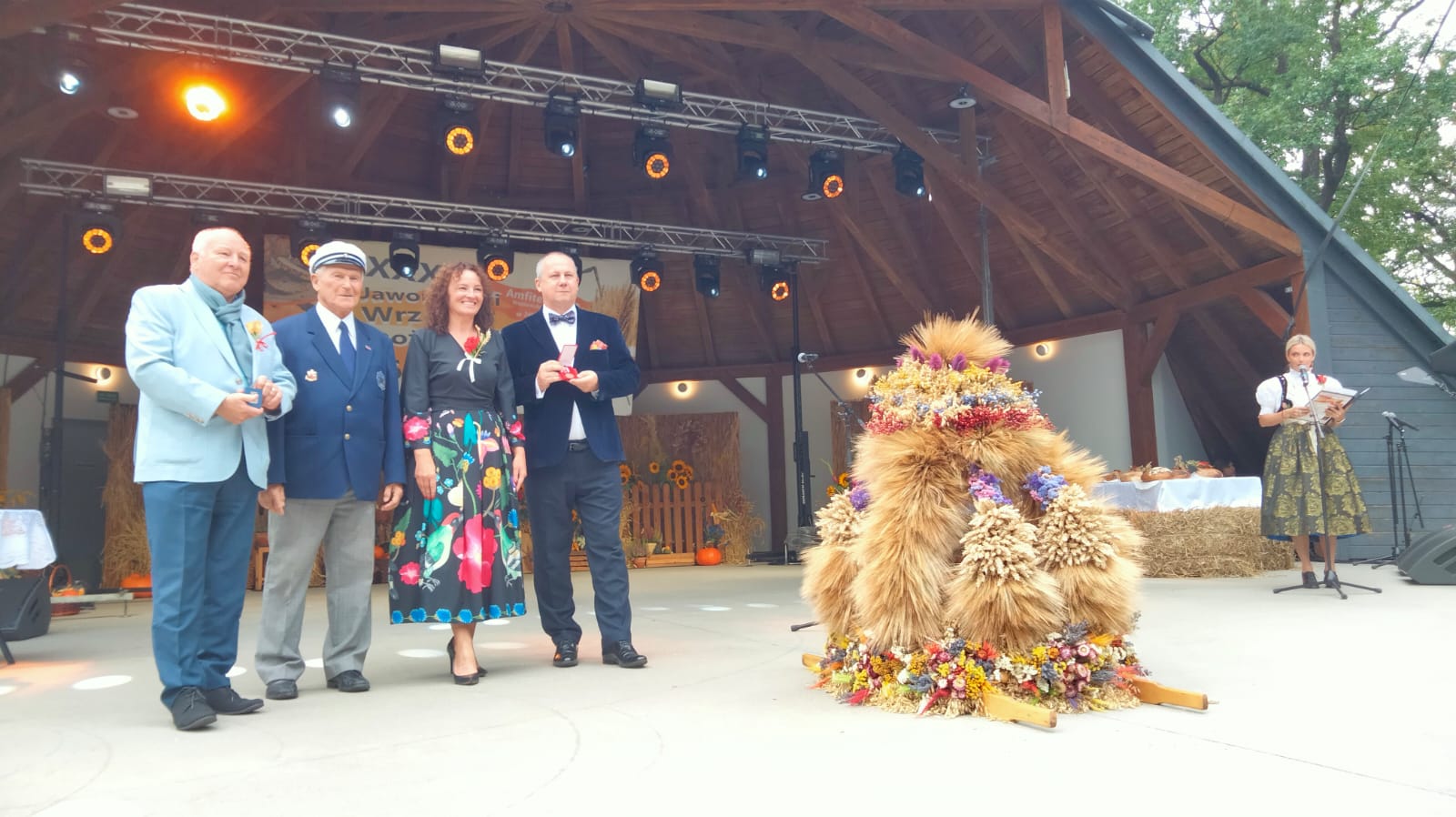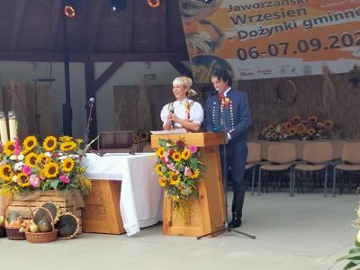 Wcześniej ulicami Jaworza przejechał barwny korowód dożynkowy prowadzony przez Wójt Gminy Annę Skotnicka-Nędzką. Na Jej ręce Starostowie Dożynek złożyli bochen chleba „owoc pracy rąk ludzkich”, by jako Gospodarz Gminy sprawiedliwie rozdzielała go wśród mieszkańców. Prezes Okręgu LMiR w Bielsku-Białej Edward Szpoczek przekazał pozdrowienia od Zarządu Głównego, a zwłaszcza od tych, którzy uprawiają polskie rzeki, jeziora i morze, by ich owocami dzielić się z tymi co na lądzie. Tym co łączy obie te grupy producentów żywności jest woda. Niestety jest jej coraz mniej. Dlatego zaapelował, by wszyscy włączyli się w ochronę i racjonalne korzystanie z jej zasobów. Od 2004 roku robi to Pani Wójt, kiedy została powołana na Sekretarza Gminy a następnie na Zastępcę Wójta, by 09.06.2024 zostać wybraną na Urząd Wójta. Od początku piastowania tych funkcji współpracowała ze Szkolnym Kołem LMiR w SP 2 oraz z Muzeum Fauny i Flory Morskiej i Śródlądowej zapewniając środki materialne na ich działalność. Dlatego Prezes Ligi kpt. ż.w. Andrzej Królikowski nadał Jej „Honorową Odznakę” - Krzyż Pro Mari Nostro”. Fakt ten potwierdził Aktem Nadania pisząc: „Z okazji 105- rocznicy Zaślubin Polski z Morzem w Pucku – w uznaniu zasług dla edukacji morskiej, krzewienia w społeczeństwie idei „Polski Morskiej” składam gratulacje i podziękowania oraz hołd wszystkim Ludziom Morza, którzy w sztafecie pokoleń wypełniają staszicowskie przesłanie „Trzymajmy się Morza”, trwając na wachcie w codziennej wiernej służbie Rzeczypospolitej Polskiej”.