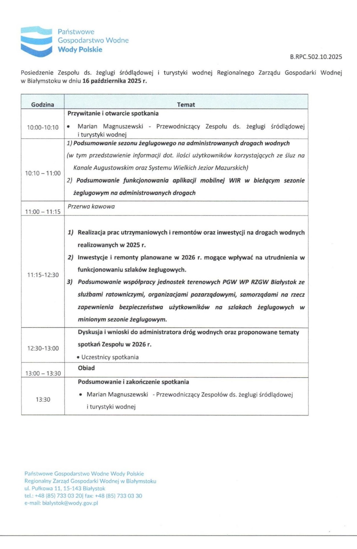 Podczas spotkania omówiono aktualny stan dróg wodnych administrowanych przez RZGW w Białymstoku, w tym szlaku Wielkich Jezior Mazurskich, drogi wodnej Kanał Augustowski oraz rzeki Narew. W związku ze zbliżającym się zakończeniem sezonu żeglugowego dokonano jego podsumowania, uwzględniając m.in. stan infrastruktury wodnej, liczbę śluzowań na poszczególnych szlakach oraz funkcjonowanie aplikacji WIR, która wspiera użytkowników w zakresie informacji i bezpieczeństwa.