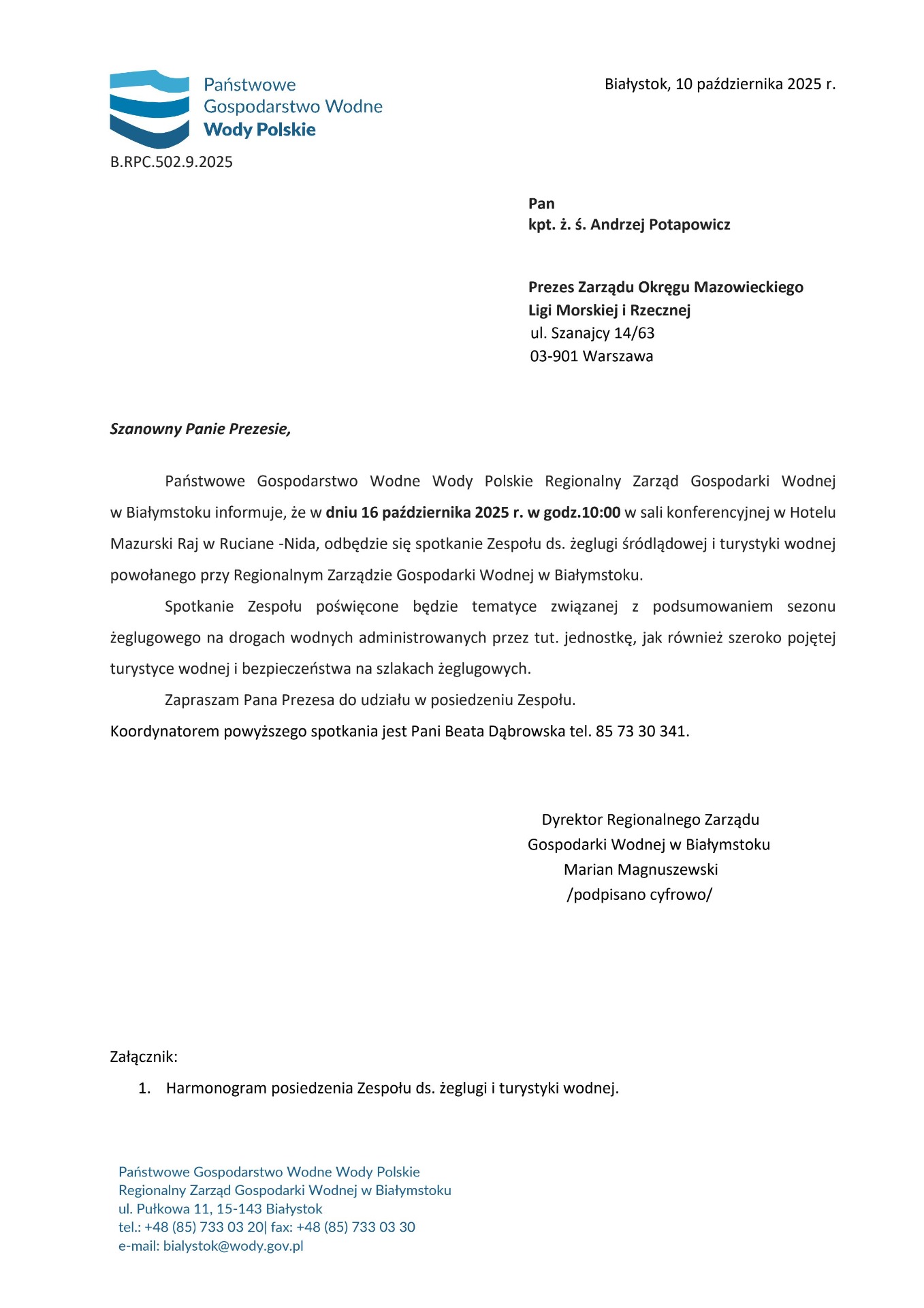 W dniu 16 października 2025 r. odbyło się spotkanie zespołu ds. żeglugi śródlądowej i turystyki wodnej, zorganizowane przez Regionalny Zarząd Gospodarki Wodnej w Białymstoku. W wydarzeniu uczestniczyli przedstawiciele RZGW, lokalni armatorzy, dyrektor Stowarzyszenia WJM 20220, dyrektor Urzędu Żeglugi Śródlądowej w Bydgoszczy – Delegatura w Giżycku, prezes Zarządu Żeglugi Mazurskiej, prezes Lokalnej Organizacji Turystycznej Ziemi Łomżyńskiej, prezes Zarządu Okręgu Mazowieckiego Ligi Morskiej i Rzecznej, prezes Mazurskiego Ochotniczego Pogotowia Ratunkowego, prezes Augustowskiego Ochotniczego Pogotowia Ratunkowego, a także przedstawiciele KZGW.